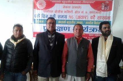 समाजकाे अावाज,काठमाण्डाै२७,कार्तीक/नेकपा एमाले काठमाण्डौ क्षेत्र नम्बर ४ ले आफ्ना १८ वटा साखाहरुमा एकै दिन एकै समय भेला तथा प्रशिक्षण कार्यक्रम सम्पन्न गरेको छ | दोश्रो अधिवेशन पछि एकै दिन सबै साखामा केन्द्रीय कमिटी का सदस्यहरुले प्रशिक्षण प्रदान गरेका थिए|संगठन , पार्टी पदत्ति , जनताको बहुदलीय जनवाद र स्थानीय निकायको निर्वाचन लगायतका बिषयहरुमा प्रशिक्षण प्रदान गरिएको थियो |